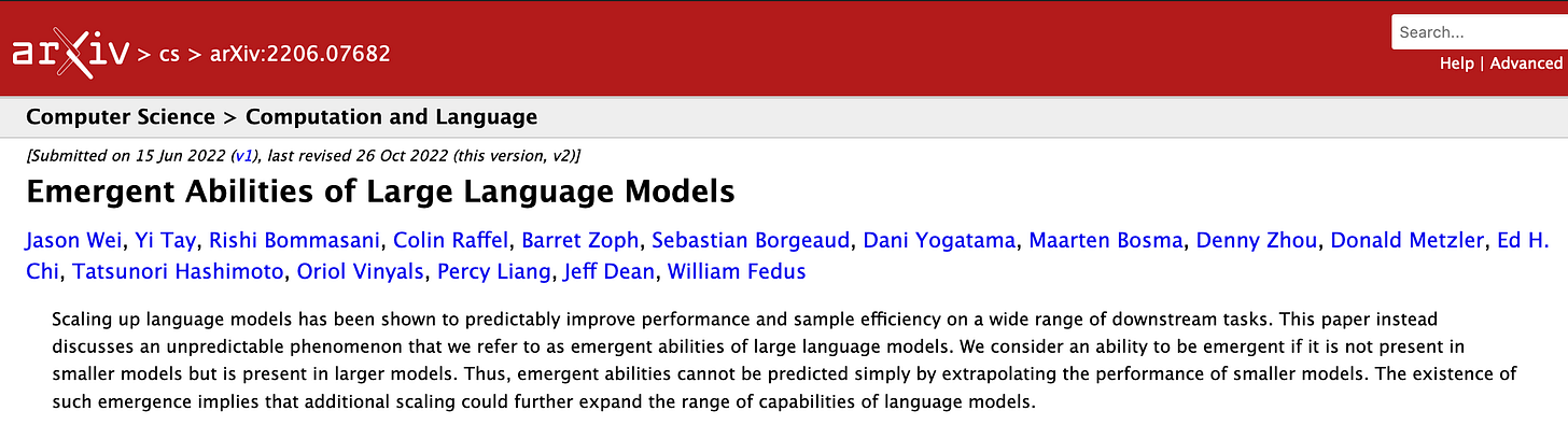 While “emergence” and the threat of AGI have made their way across the news waves and popular media, a more practical analysis of the concept of emergence has been discussed in a 2022 paper titled “Emergent Abilities of Large Language Models” authored by Google researchers.